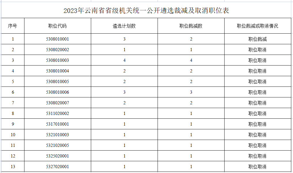 2023年云南省省級機(jī)關(guān)統(tǒng)一公開遴選公務(wù)員報(bào)名、資格審查、網(wǎng)上繳費(fèi)工作已結(jié)束。按照《2023年云南省省級機(jī)關(guān)統(tǒng)一公開遴選公務(wù)員公告》,須對未達(dá)到開考比例的1個(gè)職位進(jìn)行裁減、12個(gè)職位進(jìn)行取消,詳見《2023年云南省省級機(jī)關(guān)統(tǒng)一公開遴選裁減及取消職位表》。