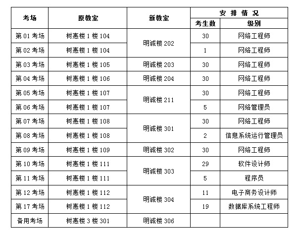 因2023年5月27日軟考筆試考場(chǎng)臨近同時(shí)開(kāi)展大型校園招聘會(huì)的體育場(chǎng),對(duì)考生答題造成較大干擾。經(jīng)研究決定,將原本設(shè)于樹(shù)蕙樓的筆試考場(chǎng)調(diào)整至明誠(chéng)樓,考生的考場(chǎng)號(hào)、座位號(hào)不變,僅教室發(fā)生改變。請(qǐng)廣大考生前往調(diào)整后的考場(chǎng)參加考試。