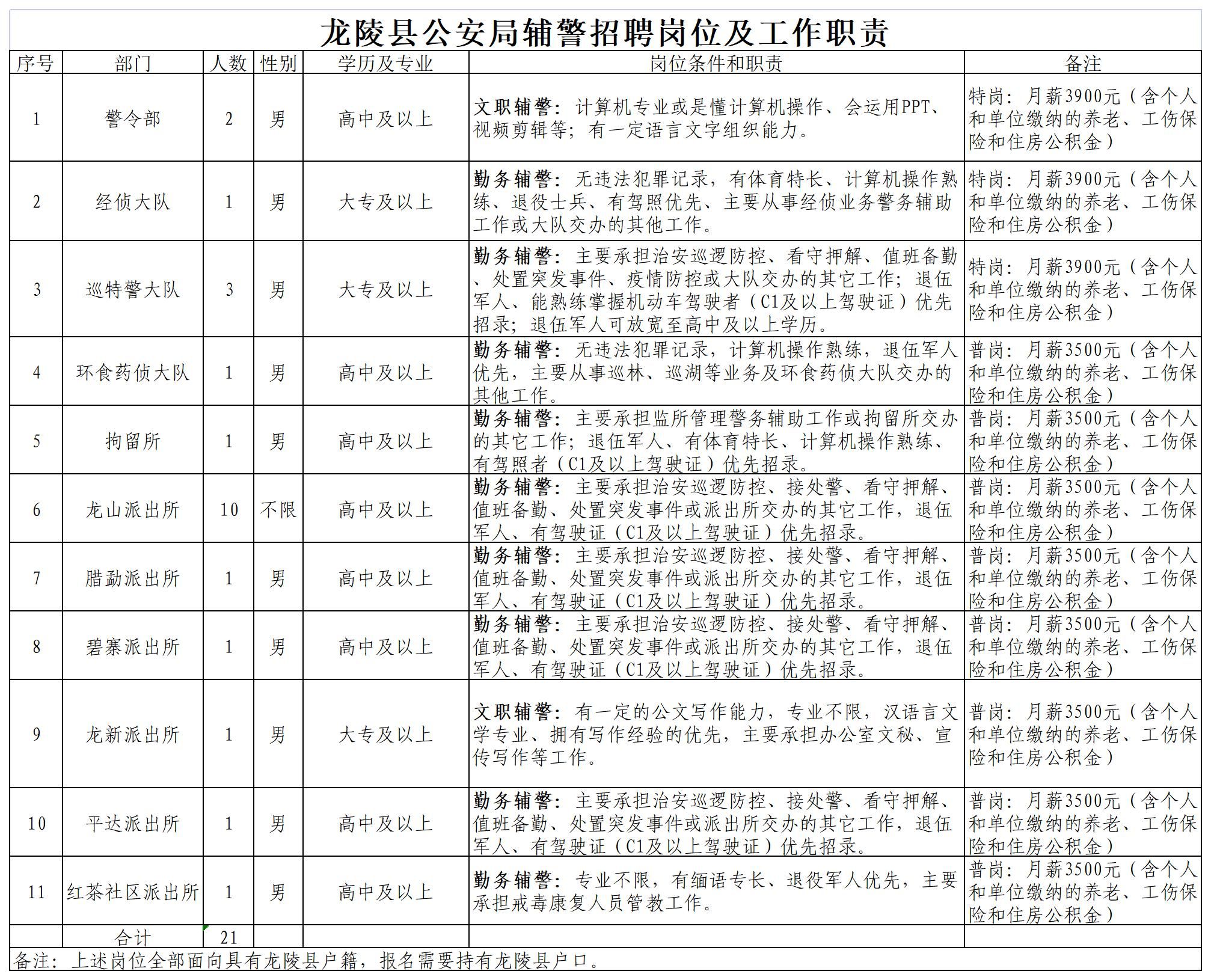 共招聘警務(wù)輔助人員21人,經(jīng)綜合考核后,確定聘用的警務(wù)輔助人員與龍陵縣公安局按規(guī)定程序訂立勞動(dòng)合同,招聘崗位、條件等詳見附件。