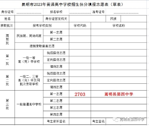 志愿填報:第三錄取批次第一志愿代碼:2703 嵩明縣第四中學(xué)。
