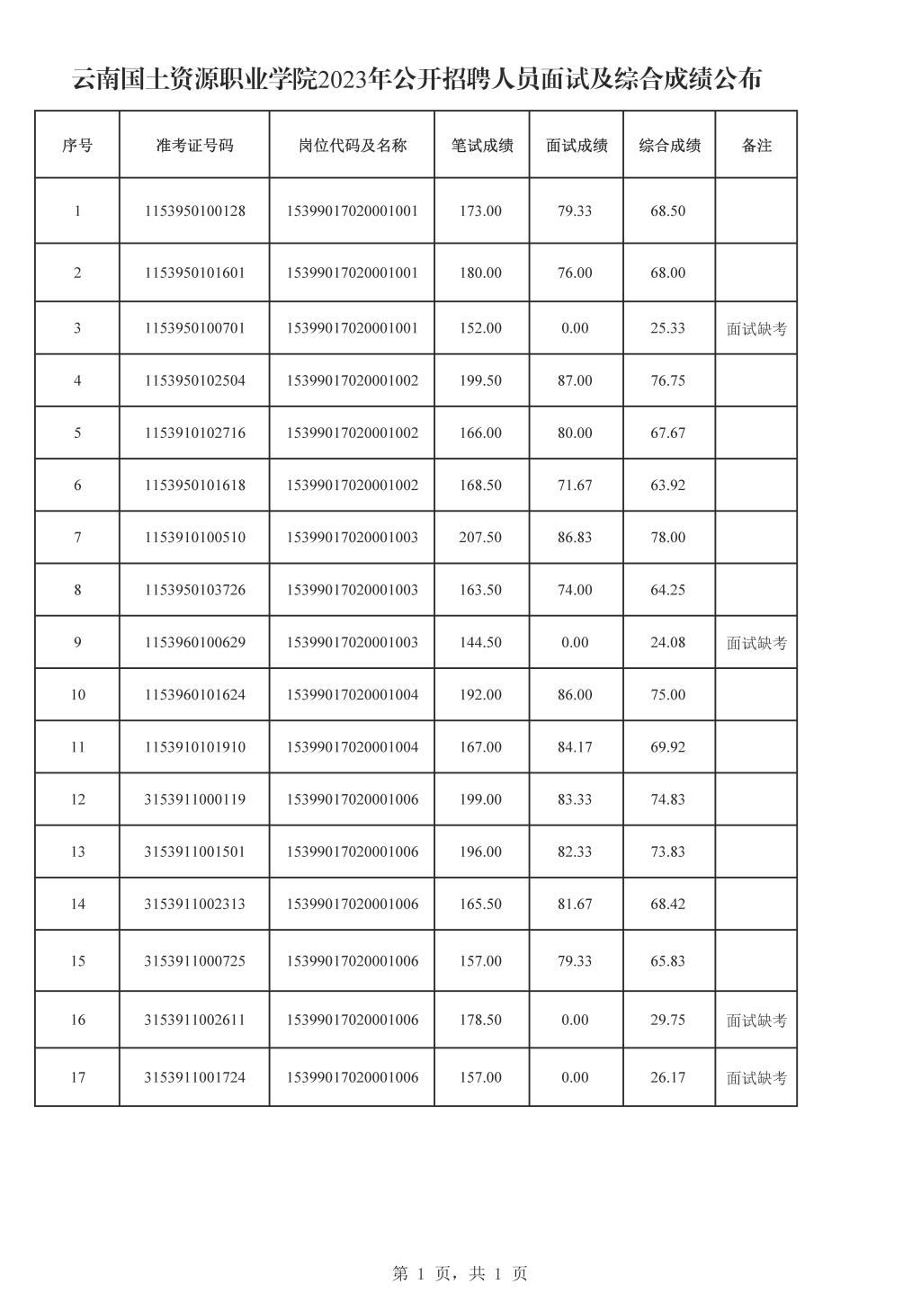 云南國土資源職業(yè)學院2023年公開招聘工作人員面試工作已于2023年7月1日進行。依據《云南國土資源職業(yè)學院2023年公開招聘人員公告》、《云南國土資源職業(yè)學院2023年公開招聘人員面試測評相關事宜的通知》中綜合成績計算方式,以及“未達到面試成績最低合格分數線的報考人員,不得進入后續(xù)程序”的規(guī)定,現對本次面試的綜合成績進行公布。