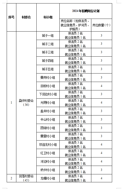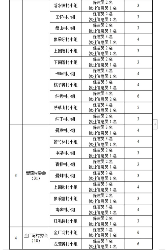 為貫徹落實黨中央、國務院關(guān)于鄉(xiāng)村振興戰(zhàn)略的決策部署,嚴格落實“四個不摘”要求,持續(xù)做好我鎮(zhèn)脫貧人口家庭就業(yè)幫扶,鞏固拓展脫貧攻堅成果同鄉(xiāng)村振興有效銜接。根據(jù)《勐臘縣促進就業(yè)工作領(lǐng)導小組辦公室關(guān)于2024年鄉(xiāng)村公益性崗位開發(fā)安置相關(guān)工作的通知》臘就業(yè)辦發(fā)〔2023〕10號文件精神和具體要求,結(jié)合勐伴鎮(zhèn)實際情況,經(jīng)研究,決定開發(fā)勐伴鎮(zhèn)150個鄉(xiāng)村公益性崗位(含監(jiān)測對象5個)?,F(xiàn)向全鎮(zhèn)各村小組發(fā)布鄉(xiāng)村公益性崗位選聘信息,公告如下: