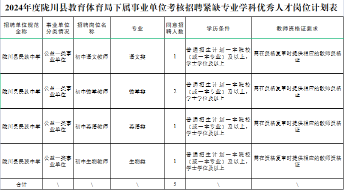 根據(jù)《關(guān)于同意縣教育體育局黨組使用編制通知單》(隴機(jī)編辦準(zhǔn)[2023]4號)、《隴川縣人力資源和社會保障局關(guān)于印發(fā)2024年教育衛(wèi)生部門考核招聘緊缺專業(yè)學(xué)科優(yōu)秀人才工作方案的通知》隴人社發(fā)〔2024〕2號文件,同意隴川縣民族中學(xué)招聘教師5人,招聘崗位屬正式在職在編專業(yè)技術(shù)人員。為認(rèn)真做好2024年考核選優(yōu)工作,現(xiàn)將相關(guān)事宜公告如下: