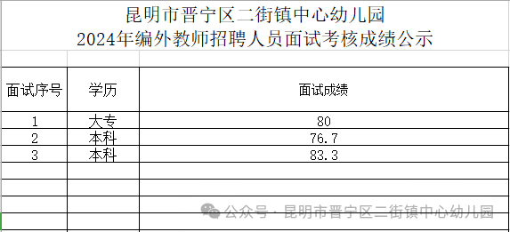 昆明市晉寧區(qū)二街鎮(zhèn)中心幼兒園編外教師面試考核成績(jī)公示