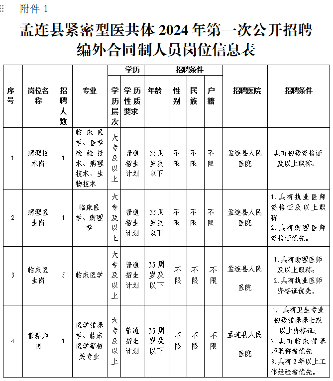 詳見《孟連縣緊密型醫(yī)共體2024年第一次公開招聘編外合同制人員崗位信息表》。
