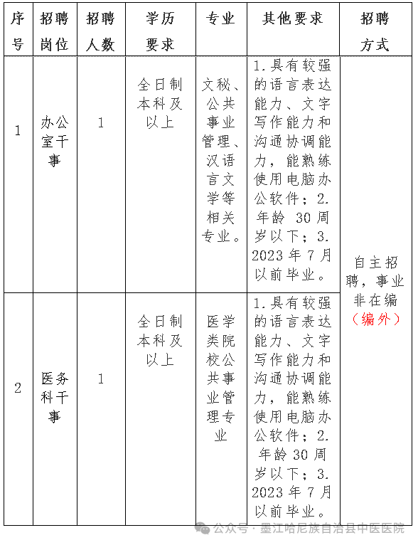根據(jù)醫(yī)院業(yè)務發(fā)展需求,為進一步加強醫(yī)院人才隊伍建設,提高服務能力,擬面向社會公開招聘(編外)1名辦公室干事、1名醫(yī)務科干事。為確保招聘工作順利進行,根據(jù)《云南省事業(yè)單位公開招聘工作人員辦法》等有關規(guī)定,現(xiàn)就我院招聘有關事宜公告如下: