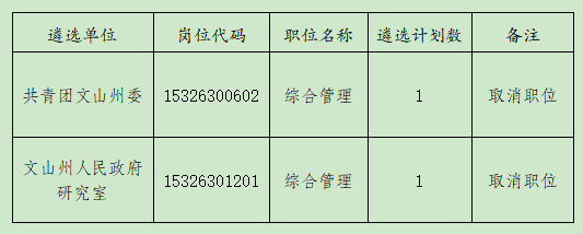 根據(jù)《文山州2024年州級機關公開遴選公務員公告》規(guī)定,對達不到開考比例的遴選職位進行取消?,F(xiàn)公告如下: