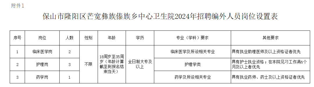 附件1:保山市隆陽(yáng)區(qū)芒寬彝族傣族鄉(xiāng)中心衛(wèi)生院2023年招聘見(jiàn)習(xí)人員崗位設(shè)置表.xlsx