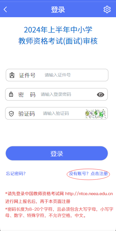 未注冊賬號的考生,點擊登錄頁的“還沒有賬號?點擊注冊”鏈接,進(jìn)入注冊頁面,按頁面上的要求填寫注冊信息。登錄時,須輸入證件號、密碼,以及驗證碼。