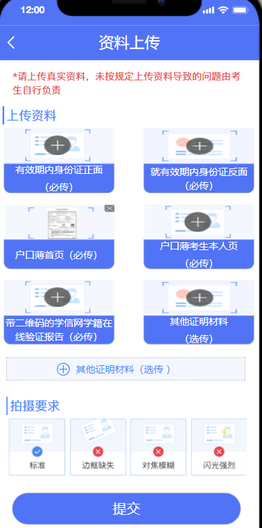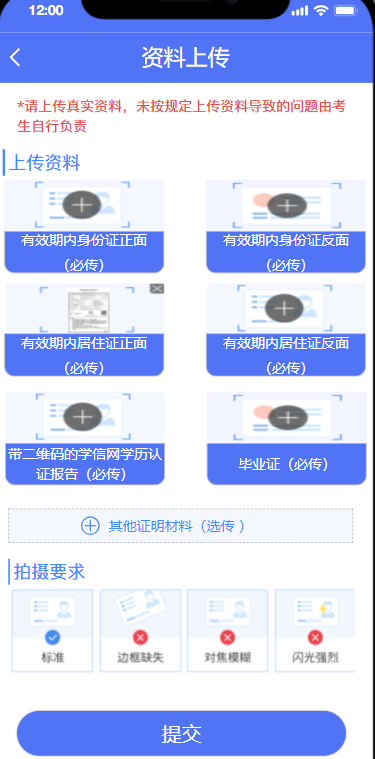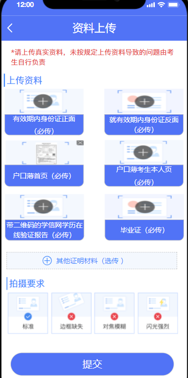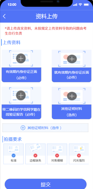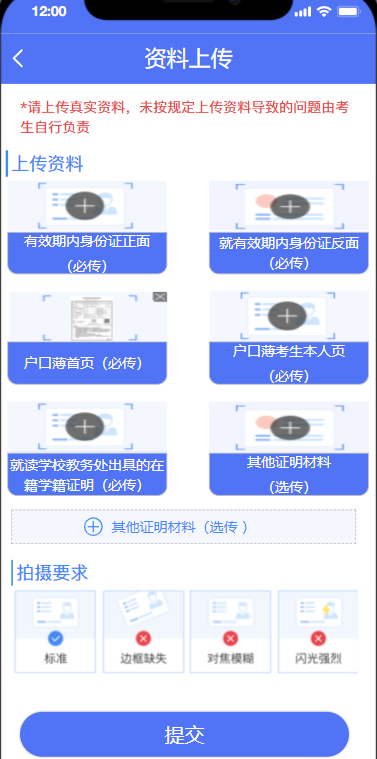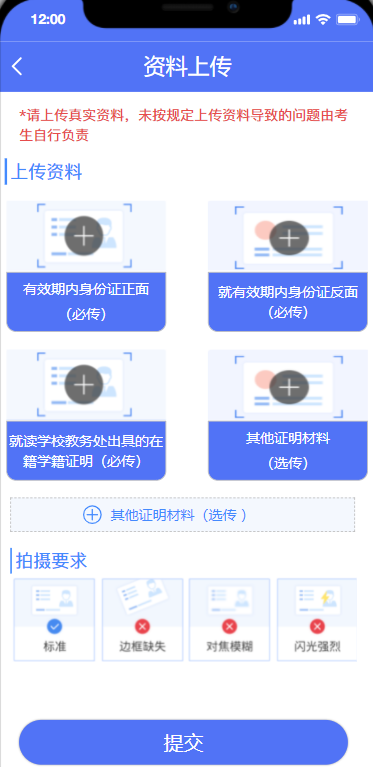 (三)請考生本著對自身負(fù)責(zé)的態(tài)度,確保上傳材料完整、真實、有效、清晰。如因上傳材料不符合要求造成審核不通過的,責(zé)任自行承擔(dān)。