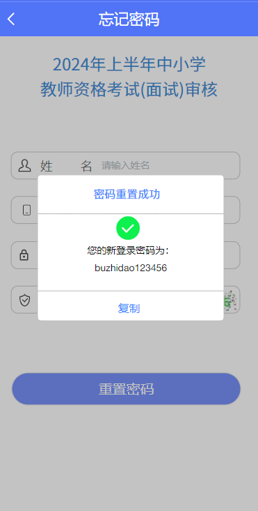 若忘記登錄密碼,可點擊登錄頁的“忘記密碼?”鏈接,重置密碼。密碼重置后,考生可復(fù)制新密碼進(jìn)行登錄。