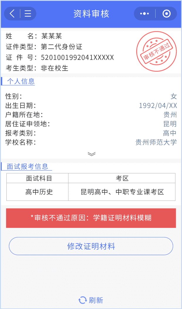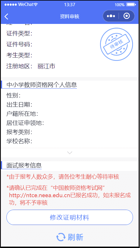 2.若因材料上傳不正確、不全而審核結(jié)論未獲通過的考生請根據(jù)反饋提示,在規(guī)定時間內(nèi)更正信息或修正上傳審核材料,截止時間為4月17日中午12:00。(注意:如果在教育部報名網(wǎng)站修改了個人信息,微信小程序必須重新上傳相應(yīng)材料)