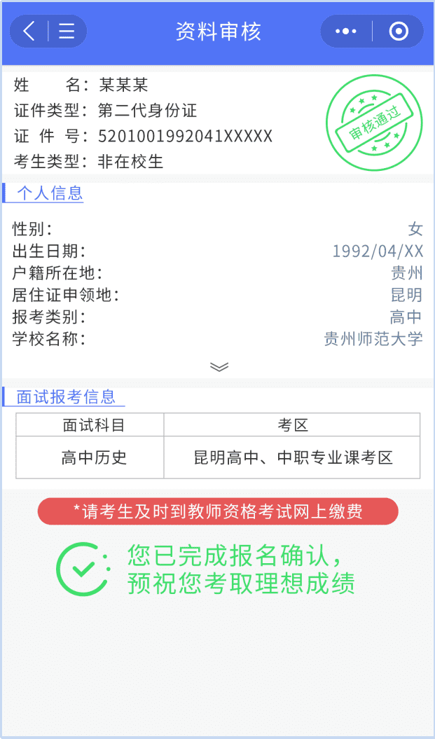 審核結(jié)論為“審核通過”且結(jié)論已同步至中小學(xué)教師資格考試網(wǎng)的考生需前往中小學(xué)教師資格考試網(wǎng)ntce.neea.edu.cn進(jìn)行繳費。繳費完成后,面試報名方能成功。