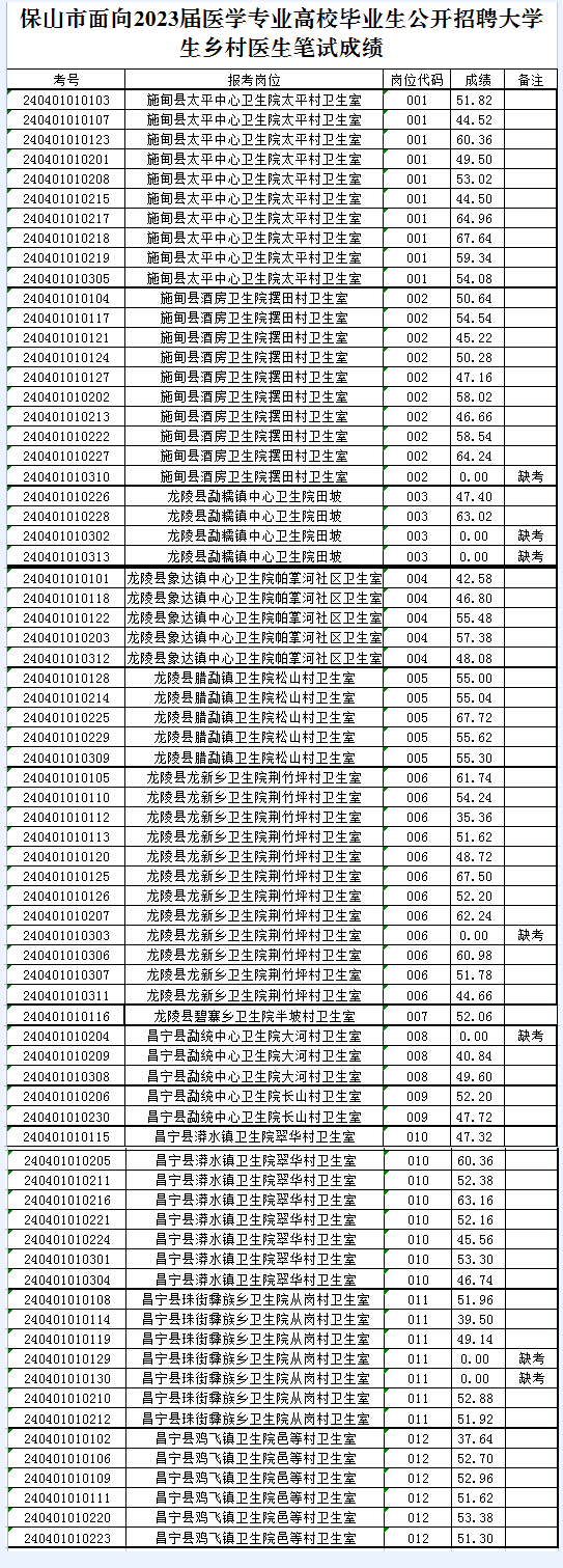 附件:保山市面向2023屆醫(yī)學專業(yè)高校畢業(yè)生公開招聘大學生鄉(xiāng)村醫(yī)生筆試成績