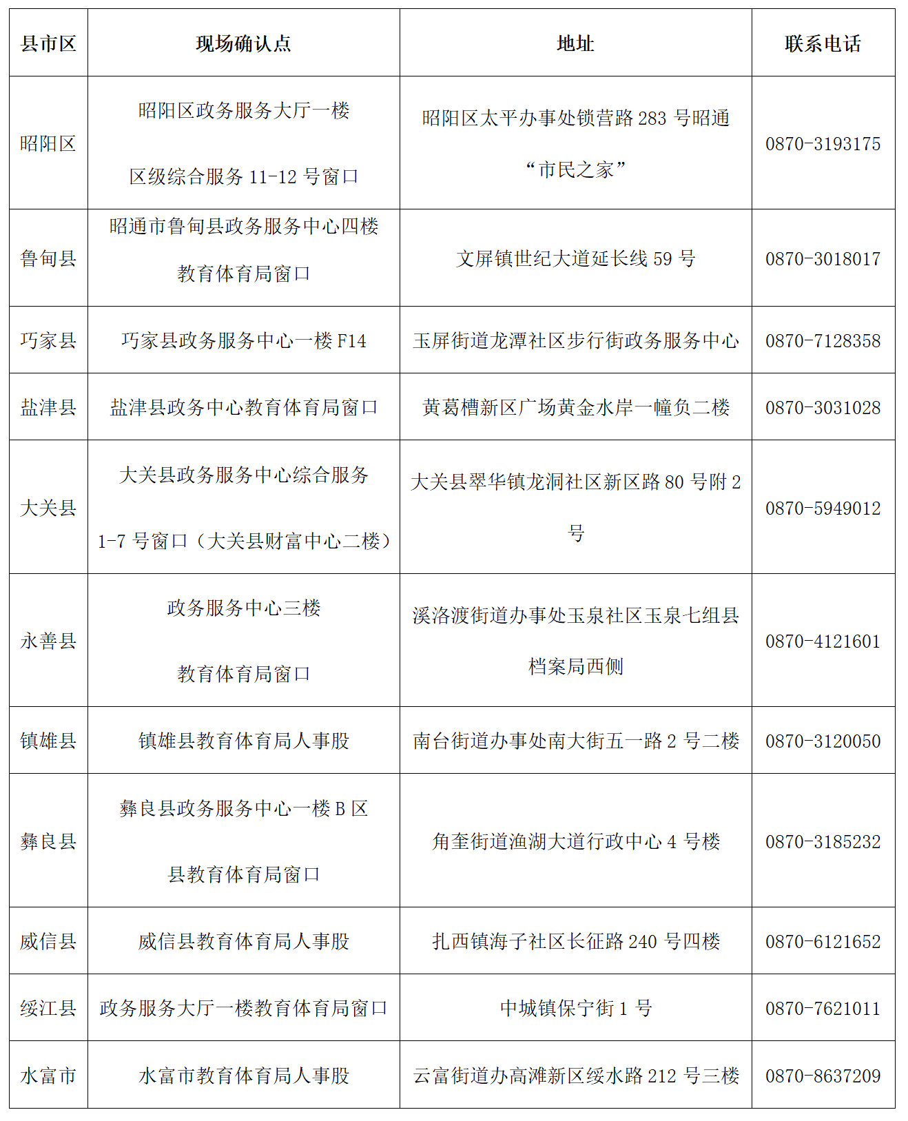 考生注意事項:現(xiàn)場確認須到申請人戶籍或居住所在地縣(市、區(qū))政務中心教育體育窗口或教育體育局進行確認。咨詢電話如下: