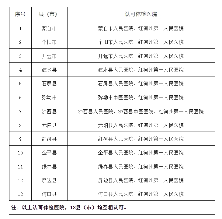 (7)《云南省申請教師資格認定人員體檢表》原件(見附件1)。經(jīng)紅河州轄區(qū)內(nèi)縣級以上公立醫(yī)院體檢后(認可體檢醫(yī)院詳見附件2),體檢結(jié)論簽署 “合格”且有體檢醫(yī)院意見并加蓋公章的《云南省教師資格認定體檢表》原件,體檢報告僅限當次認定有效。