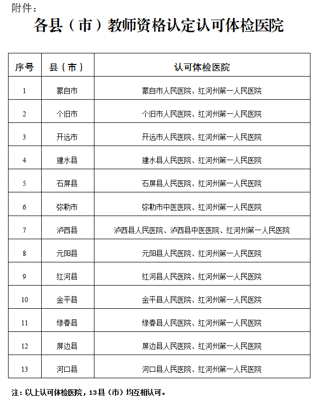(四)能適應教育教學工作的需要,具有良好的身體素質(zhì)和心理素質(zhì)。申請人須按照《教育部教師資格認定指導中心關于調(diào)整申請認定幼兒園教師資格人員體檢標準的通知》(教資字〔2010〕15號)、《人力資源和社會保障部教育衛(wèi)生部關于進一步規(guī)范入學和就業(yè)體檢項目維護乙肝表面抗原攜帶者入學和就業(yè)權利的通知》(人社部發(fā)〔2010〕12號)、《云南省申請教師資格人員體檢辦法》(詳見省教育廳公告)要求,在教師資格認定機構認可的縣級以上醫(yī)院體檢合格(紅河州認可醫(yī)院詳見附件)。