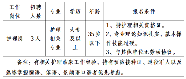 備注:有相關(guān)護(hù)理臨床工作經(jīng)驗(yàn)、持有預(yù)防接種證、退役軍人以及熟練掌握緬語、傣語、景頗語口語者優(yōu)先考慮。
