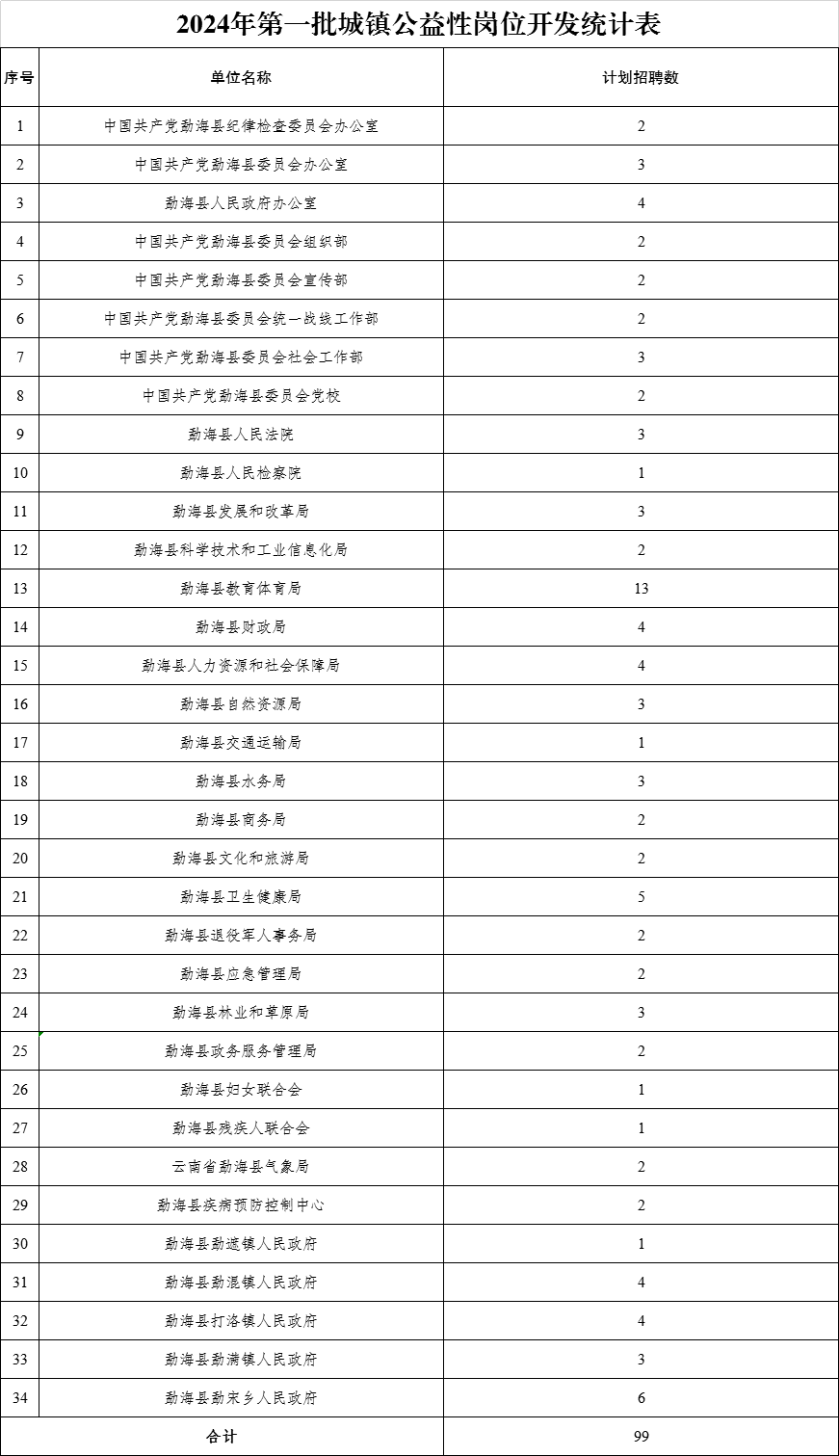 招聘崗位99個(gè)。具體招聘崗位數(shù)量詳見《勐??h2024年第一批城鎮(zhèn)公益性崗位開發(fā)統(tǒng)計(jì)表》。