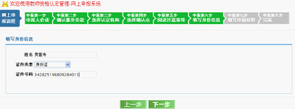 輸入申請(qǐng)人的姓名、證件類(lèi)型和證件號(hào)碼,點(diǎn)擊“下一步”按鈕,如系統(tǒng)校驗(yàn)通過(guò)則進(jìn)入申報(bào)第七步。