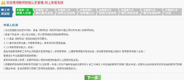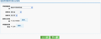 首先選擇資格種類(lèi),根據(jù)選定的資格種類(lèi)控制認(rèn)定機(jī)構(gòu)下拉列表的顯示內(nèi)容。選擇省和選擇市作為篩選認(rèn)定機(jī)構(gòu)的條件,選擇了省或市后,點(diǎn)擊選擇認(rèn)定機(jī)構(gòu)后的“選擇”按鈕,則會(huì)顯示出所選省及市下所有能認(rèn)定申報(bào)的教師資格的認(rèn)定機(jī)構(gòu)。如果所選擇的認(rèn)定機(jī)構(gòu)沒(méi)有開(kāi)通網(wǎng)報(bào)或者網(wǎng)報(bào)時(shí)間未到以及過(guò)了網(wǎng)報(bào)時(shí)間,則會(huì)給出提示,不能進(jìn)行下一步,否則點(diǎn)擊下一步后進(jìn)入申報(bào)第四步。