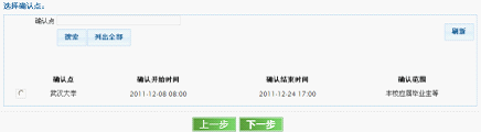 確認(rèn)點(diǎn)列表中會(huì)顯示所選認(rèn)定機(jī)構(gòu)網(wǎng)報(bào)時(shí)間段內(nèi)所有參與確認(rèn)工作的確認(rèn)點(diǎn)信息供申請(qǐng)人選擇。如果沒(méi)有選擇確認(rèn)點(diǎn),點(diǎn)擊“下一步”時(shí),會(huì)給出提示。