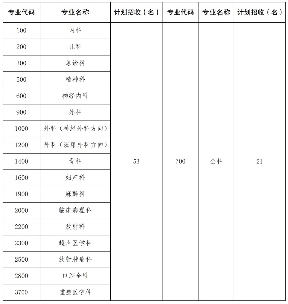 2024年我院計(jì)劃招收74名住培醫(yī)師,其中全科專業(yè)計(jì)劃招收21名,其他專業(yè)計(jì)劃招收53名,具體招收如下: