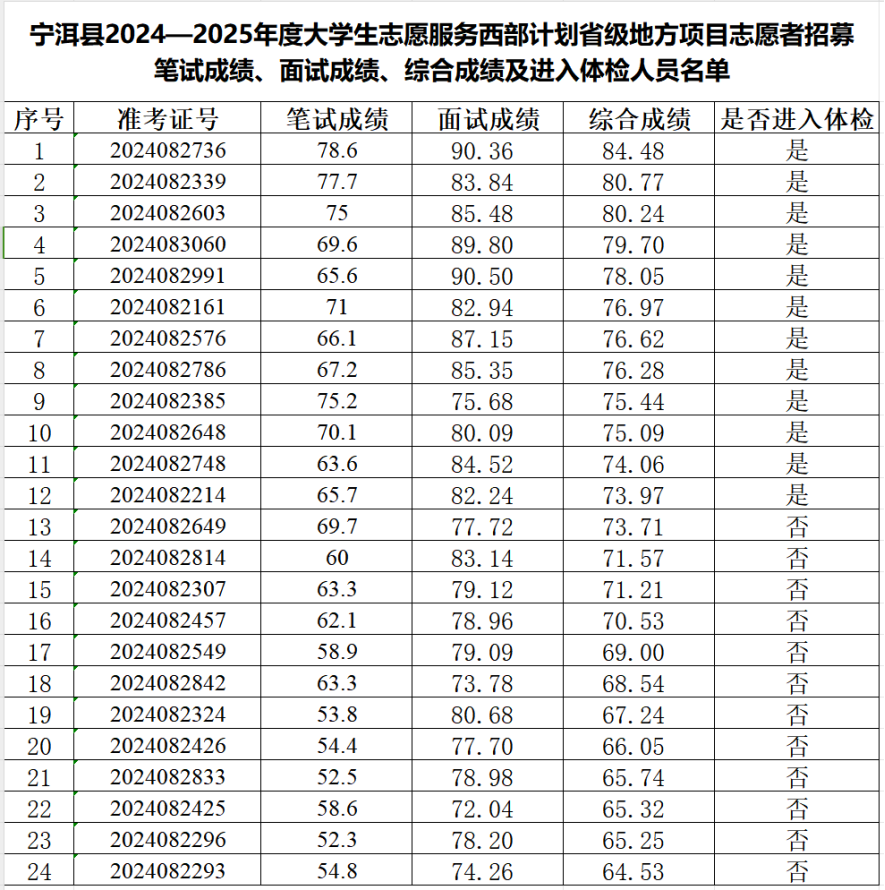 寧洱縣2024—2025年度大學(xué)生志愿服務(wù)西部計(jì)劃省級地方項(xiàng)目志愿者招募筆試成績、面試成績、綜合成績及進(jìn)入體檢人員名單如下: