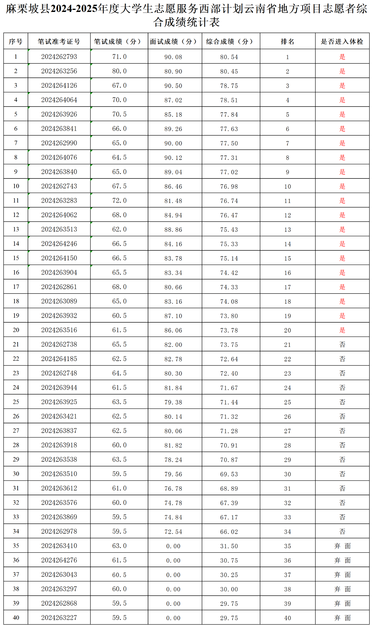 根據(jù)麻栗坡縣2024—2025年度大學生志愿服務西部計劃省級地方項目志愿者招募程序和《關于做好2024—2025年度云南省大學生志愿者服務西部計劃地方項目志愿者招募派遣工作的通知》《關于做好文山州2024—2025年度西部計劃省級地方項目志愿者招募工作的通知》文件要求,麻栗坡縣項目辦于2024年7月5日組織開展相關面試工作,現(xiàn)將考生的最終綜合成績=(筆試成績×50%+面試成績×50%,綜合成績通過計算四舍五入保留兩位小數(shù)。)公布如下(公示時間為2024年7月5日-2024年7月7日):