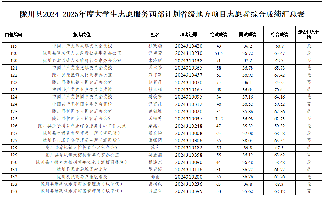 隴川縣2024-2025年度大學(xué)生志愿服務(wù)西部計(jì)劃省級(jí)地方項(xiàng)目志愿者面試工作于7月5日順利舉行。此次面試按照“公平公開(kāi)公正”的原則,采用結(jié)構(gòu)化面試方式,重點(diǎn)對(duì)考生組織協(xié)調(diào)、語(yǔ)言表達(dá)、志愿者服務(wù)認(rèn)知和舉止儀表等方面進(jìn)行了全面考核?,F(xiàn)將成績(jī)公布如下: