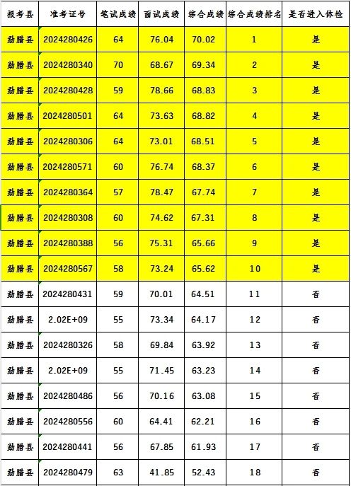 勐臘縣2024—2025年度大學生志愿服務(wù)西部計劃地方項目招募擬進入體檢人員名單根據(jù)報考者綜合成績從高到低的順序,按招募崗位1:1的比例來確定(綜合成績計算方法:綜合成績=筆試成績50%+面試成績50%)。名單如下: