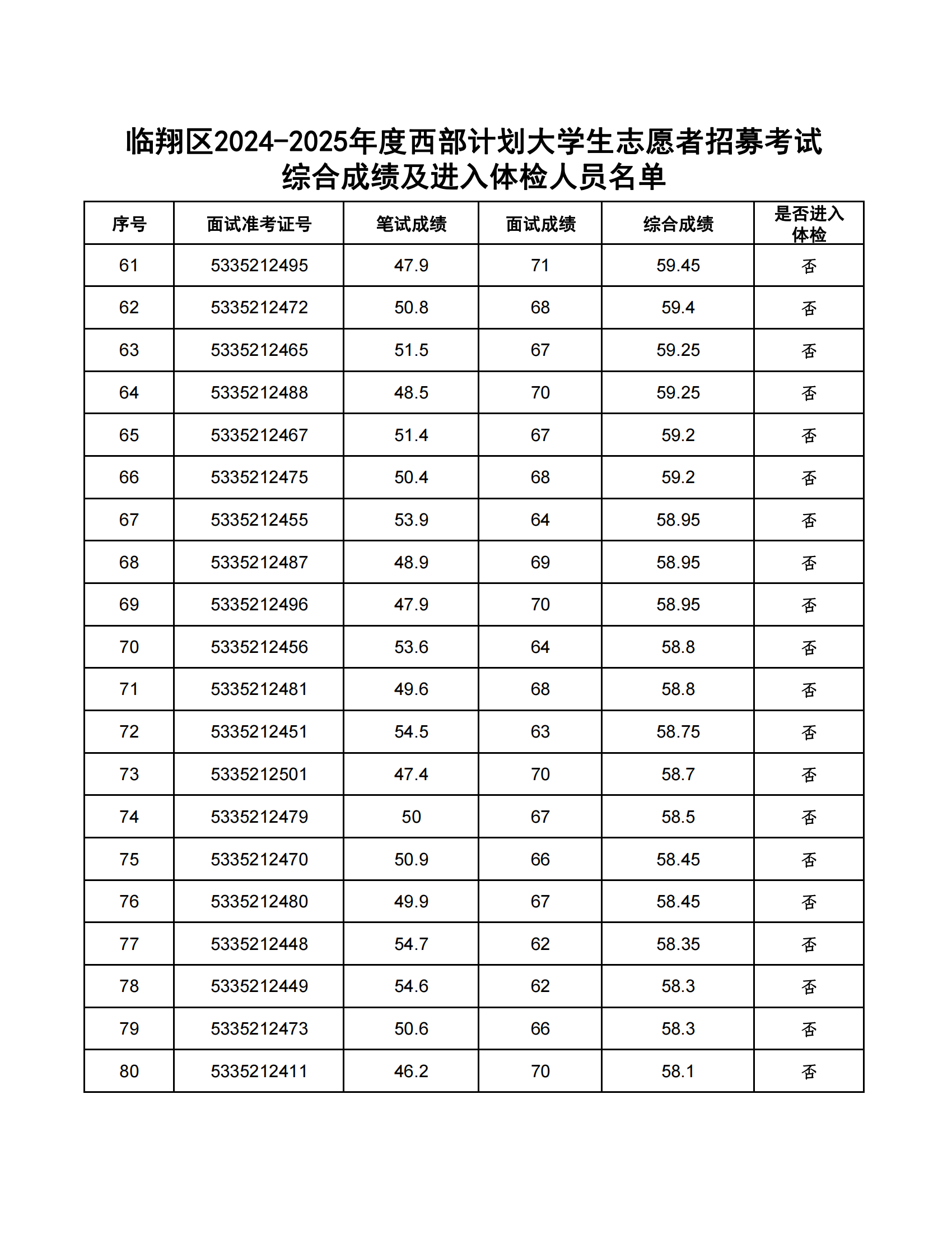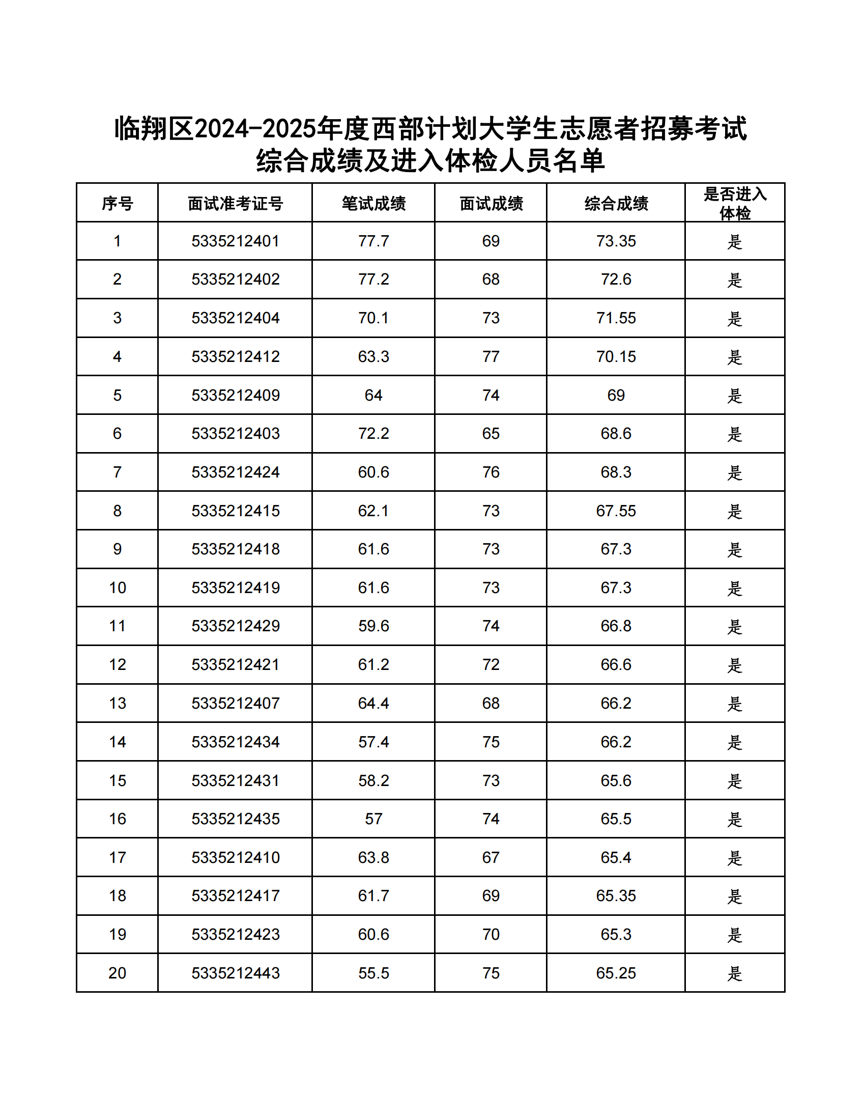 臨翔區(qū)2024-2025年度大學(xué)生志愿服務(wù)西部計(jì)劃省級(jí)地方項(xiàng)目志愿者計(jì)劃招募54人。根據(jù)《臨翔區(qū)2024-2025年度西部計(jì)劃志愿者招募公告》,經(jīng)報(bào)名、資格審核、筆試等程序,共有108人進(jìn)入復(fù)試。現(xiàn)將綜合成績(jī)公告如下:(綜合成績(jī)=筆試成績(jī)×50%+復(fù)試成績(jī)×50%),綜合成績(jī)并列的,以筆試成績(jī)高者優(yōu)先。