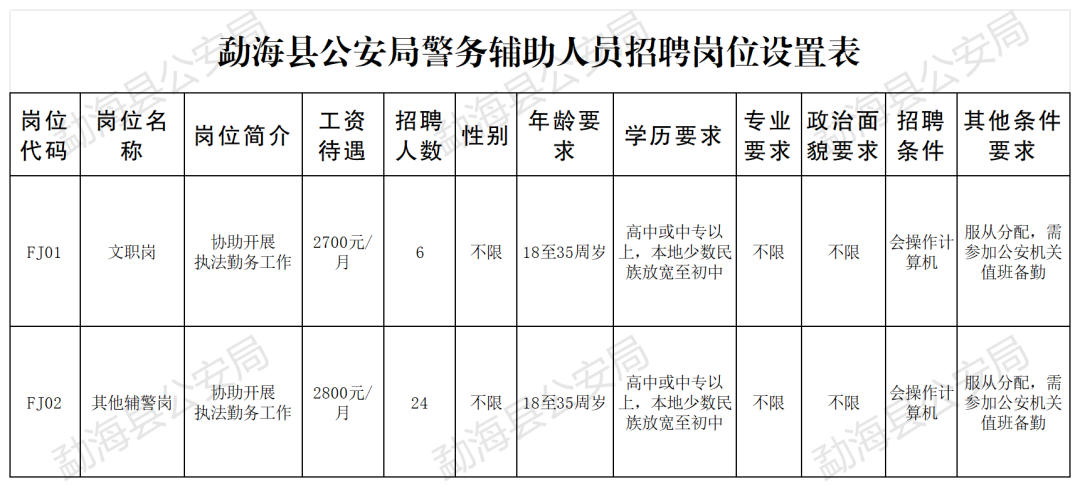 根據(jù)工作需要,勐??h公安局現(xiàn)面向社會公開招聘警務(wù)輔助人員(以下簡稱輔警),有關(guān)事項(xiàng)公告如下: