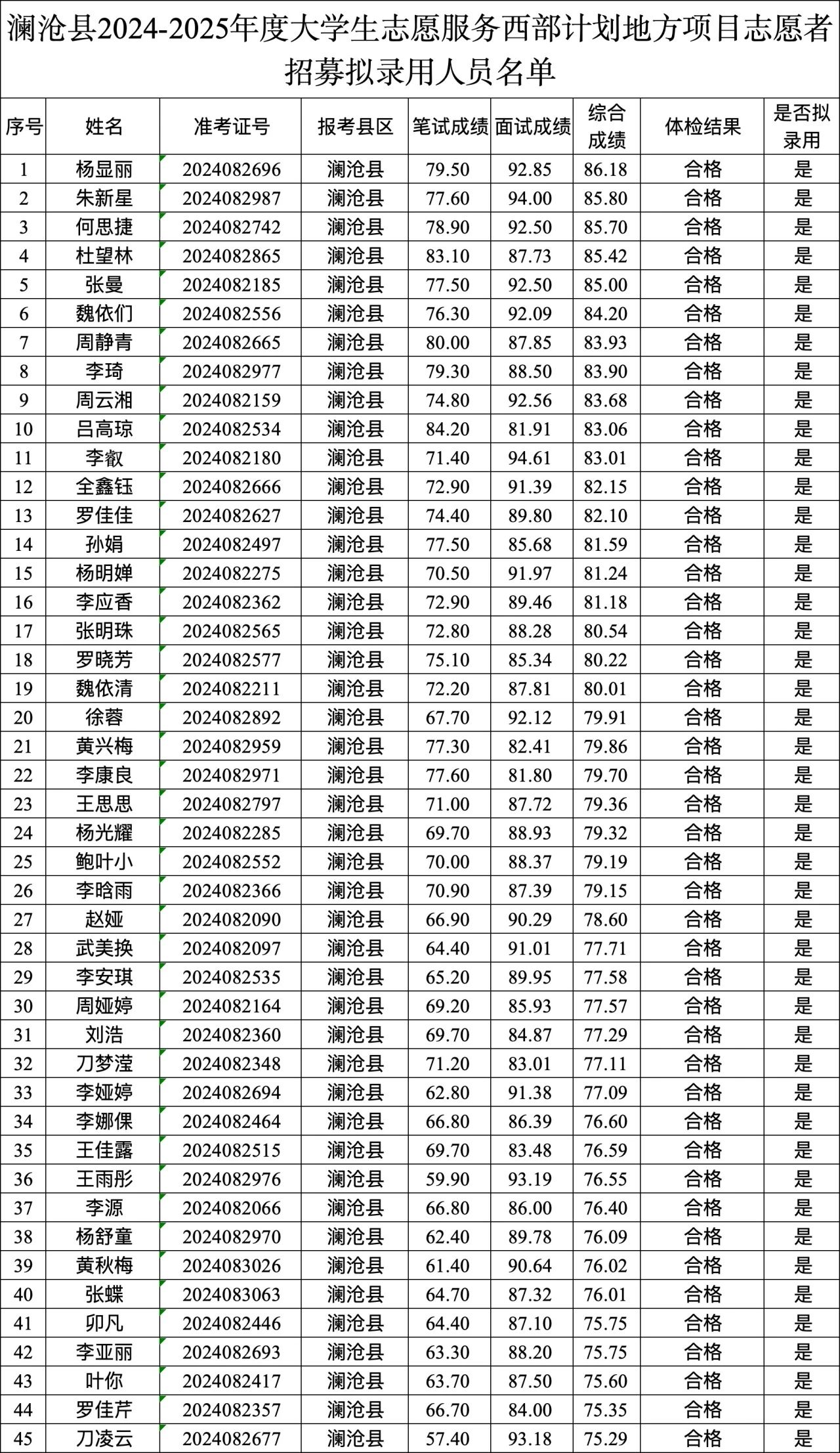 按照共青團普洱市委《關于做好2024-2025年度大學生志愿服務西部計劃省級地方項目志愿者招募工作的通知》要求,經過網上報名、資格審核、筆試、資格復審、面試、體檢等環(huán)節(jié),現(xiàn)將瀾滄縣2024-2025年度大學生志愿服務西部計劃省級地方項目志愿者擬錄用人員名單進行公示。