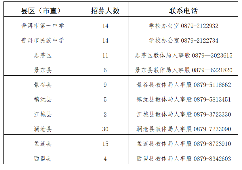 2024年秋季學(xué)期普洱市計(jì)劃招募基礎(chǔ)教育銀齡教師110名,招募縣區(qū)、人數(shù)和聯(lián)系方式如下(具體崗位需求詳見附件):