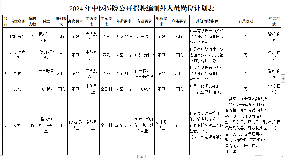招聘崗位及人數(shù)等詳見附件1《2024年中醫(yī)醫(yī)院公開招聘編制外人員崗位計(jì)劃表》。