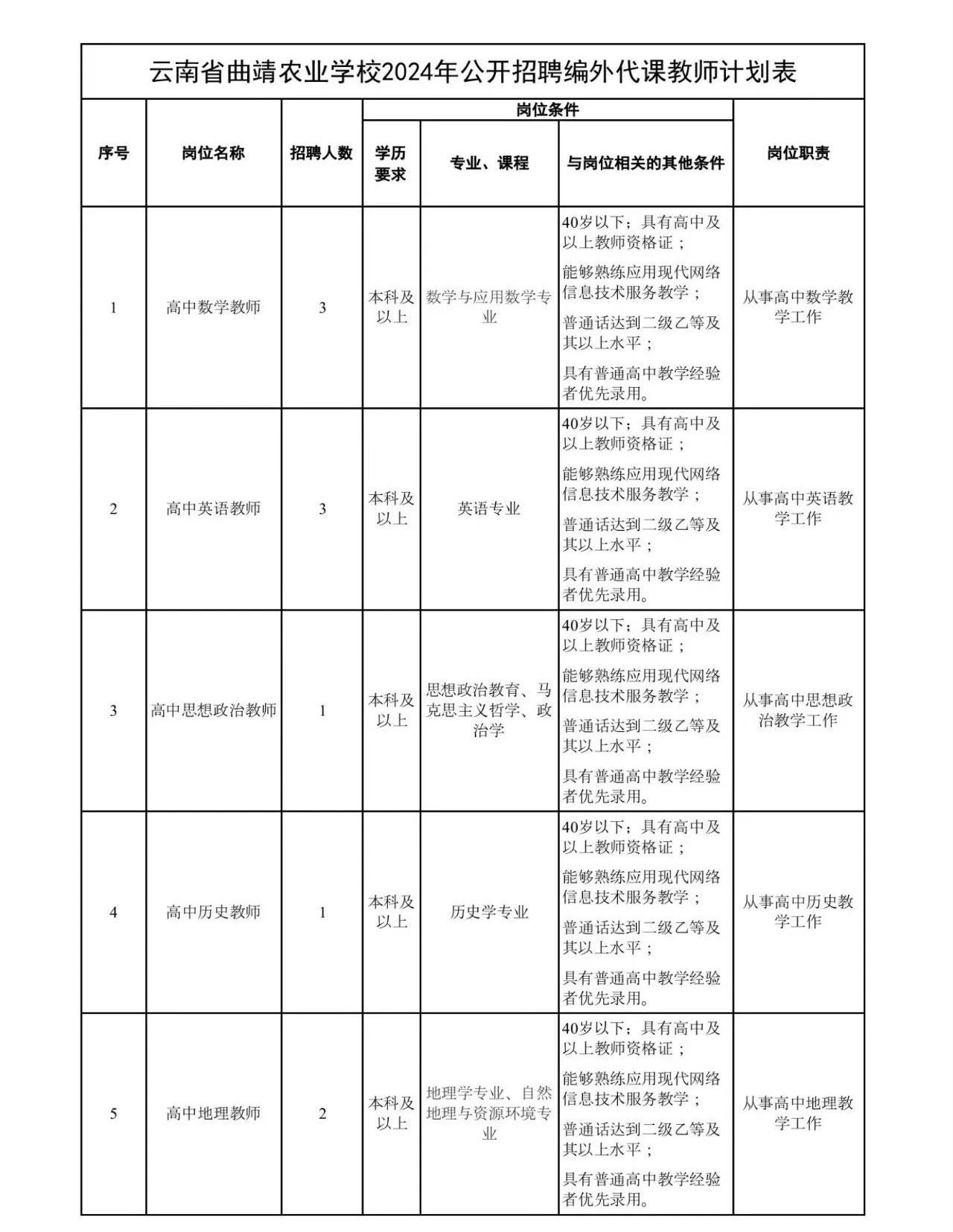 云南省曲靖農業(yè)學校2024年公開招聘編外代課教師