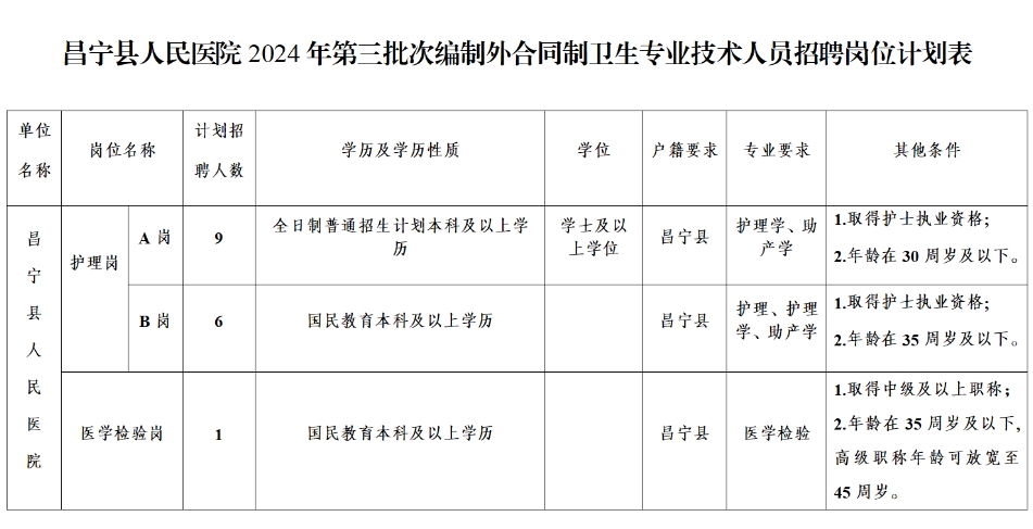為加強(qiáng)醫(yī)院人才隊(duì)伍建設(shè),不斷提高醫(yī)院綜合服務(wù)能力和水平,結(jié)合工作需要,經(jīng)研究,現(xiàn)將昌寧縣人民醫(yī)院2024年第三批次編制外合同制衛(wèi)生專業(yè)技術(shù)人員招聘有關(guān)事項(xiàng)公告如下: