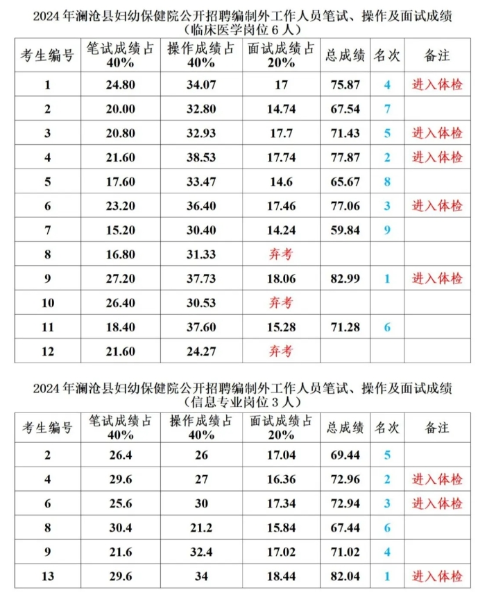 根據(jù)《瀾滄縣緊密型醫(yī)共體成員單位(婦幼保健院)2024年第三批人才招聘公告》,9月9日、9月18日,瀾滄縣婦幼保健院在1號樓六樓進行了人才招聘綜合筆試、技能操作及面試考試,現(xiàn)將2024年瀾滄縣婦幼保健院第三批公開招聘編制外工作人員成績公示如下: