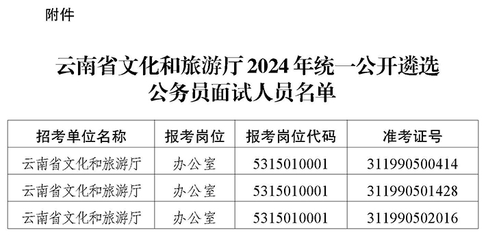 附件:云南省文化和旅游廳2024年統(tǒng)一公開遴選公務(wù)員面試人員名單