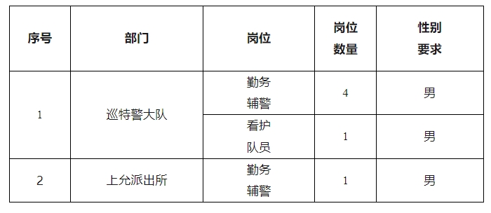 本次面向社會公開共招錄6名警務(wù)輔助人員(男性),其中勤務(wù)輔警5名,看護(hù)隊(duì)員1名。