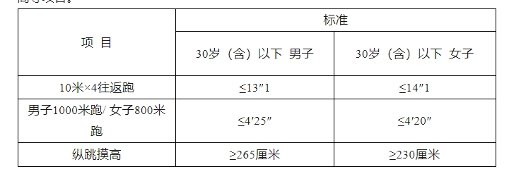 (一)體能測評體能測評時(shí)間和地點(diǎn):另行通知。評測標(biāo)準(zhǔn):參照《公安機(jī)關(guān)錄用人民警察體能測試項(xiàng)目和標(biāo)準(zhǔn)(暫行)》(人社部發(fā)【2011】48號)進(jìn)行評定,內(nèi)容含10米X4往返跑、1000米(女子800米)跑、縱跳摸高等項(xiàng)目。