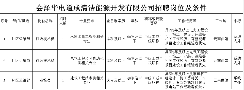 附件:會澤華電道成清潔能源開發(fā)有限公司招聘崗位及條件