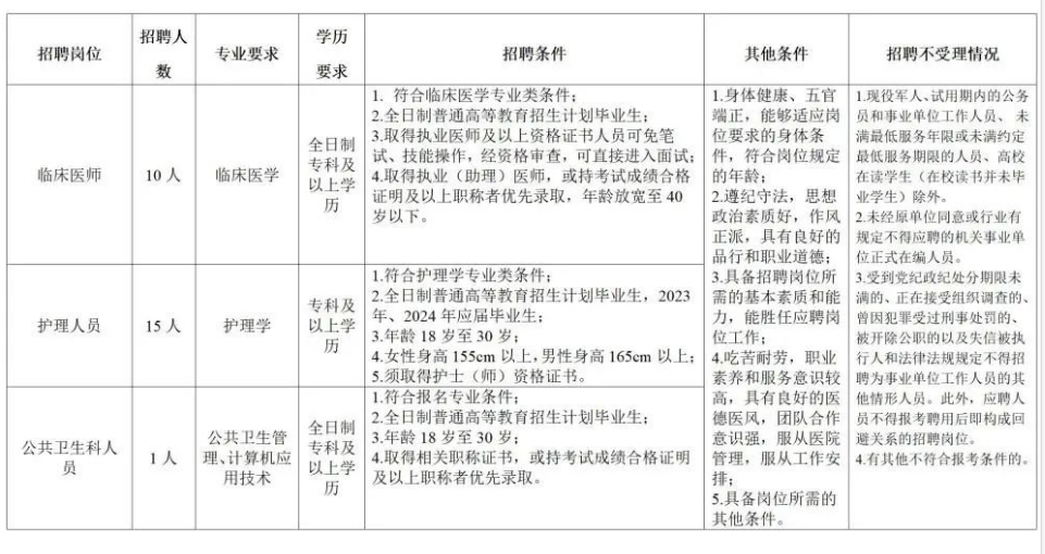 確實(shí)因工作需要,2024年應(yīng)屆畢業(yè)的臨床醫(yī)學(xué)專業(yè)類、口腔醫(yī)學(xué)專業(yè)類、醫(yī)學(xué)影像學(xué)專業(yè)類及其他專業(yè)技術(shù)人員,有學(xué)習(xí)成績(jī)優(yōu)秀、“德、能、勤、績(jī)”工作突出可無(wú)證破格聘用,但要求須在 3 年內(nèi)取得相應(yīng)專業(yè)技術(shù)資格證書和執(zhí)業(yè)資格證書,否則解聘。