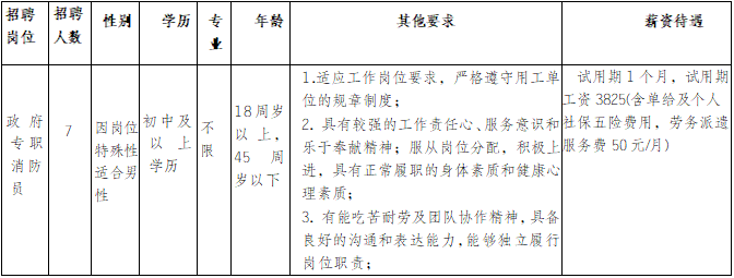 本次計(jì)劃公開招聘政府專職消防員7人,報(bào)考人員在符合招聘基本條件基礎(chǔ)上,需符合崗位招聘條件,具體崗位及資格范圍條件詳見下表: