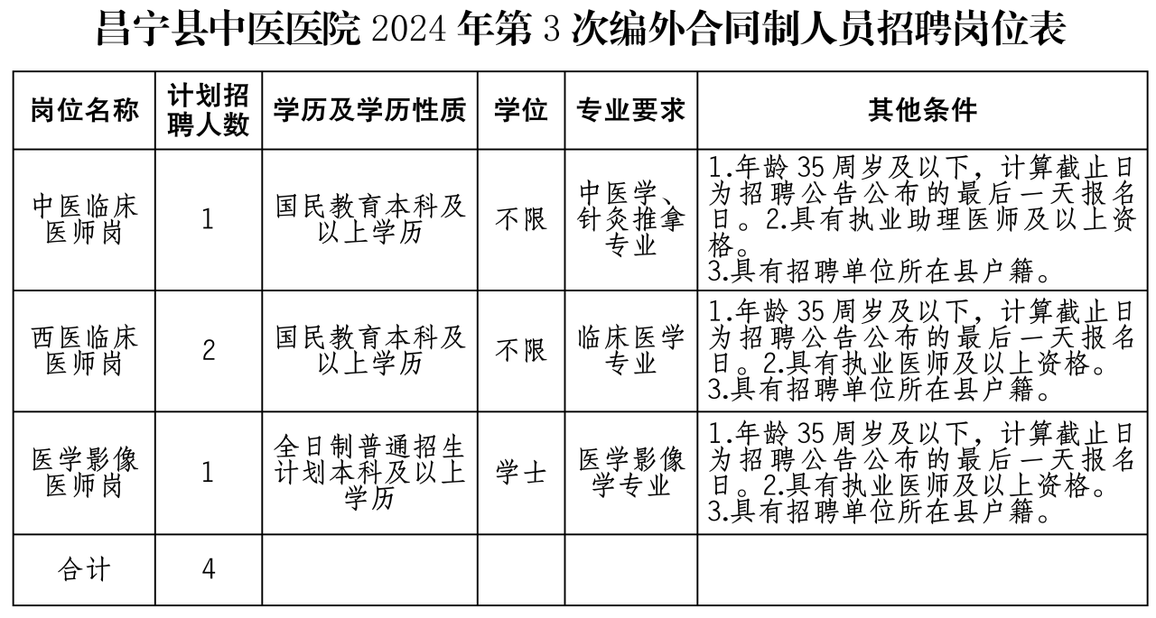 昌寧縣中醫(yī)醫(yī)院2024年第3次編外合同制人員招聘公告