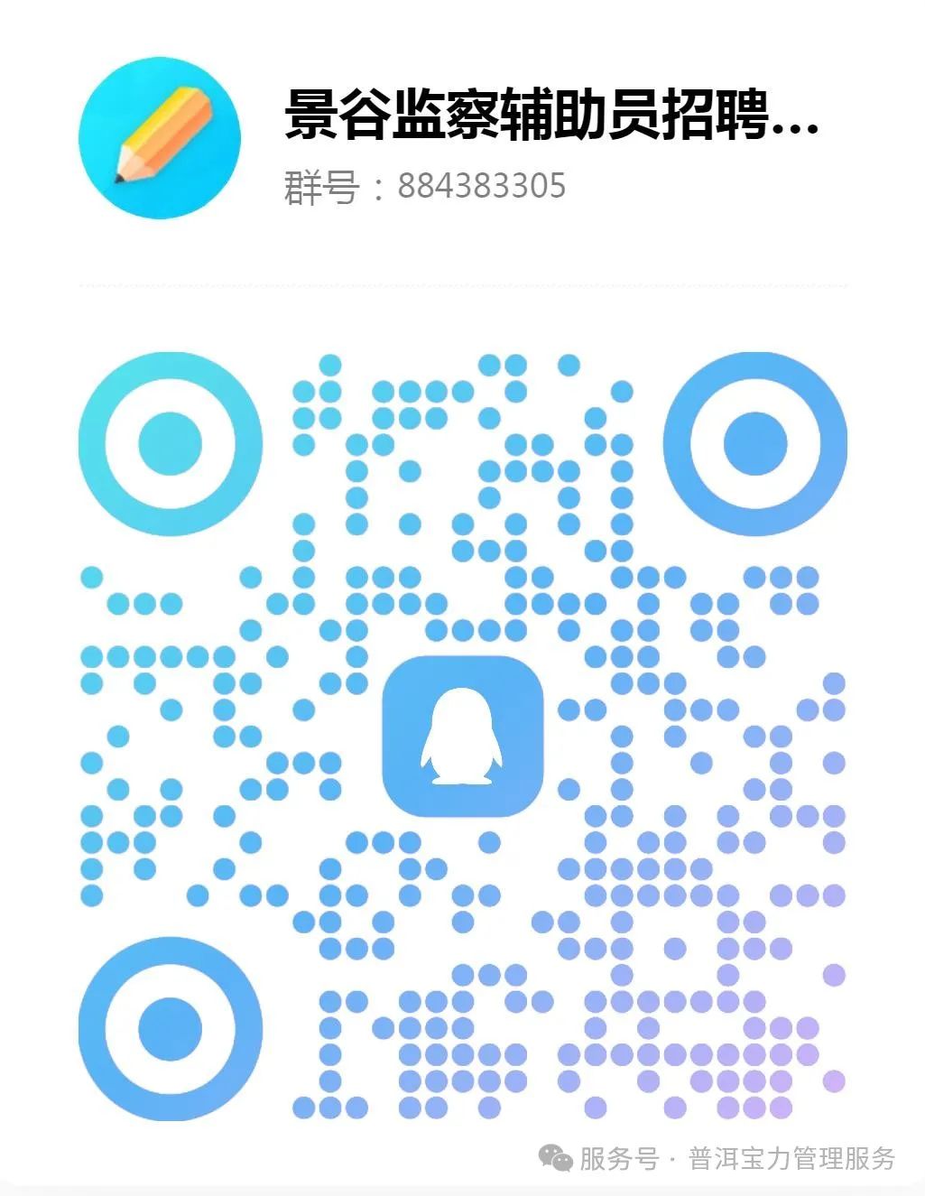 (四)招聘工作期間,報(bào)考人員應(yīng)及時(shí)關(guān)注招聘工作信息(微信公眾號“普洱寶力管理服務(wù)”,二維碼附后),并掃碼加入本次招聘考試QQ群(二維碼附后);保持聯(lián)系電話暢通,因通訊不暢或未及時(shí)關(guān)注招聘工作信息等原因?qū)е孪嚓P(guān)后果由報(bào)考人員本人承擔(dān)。