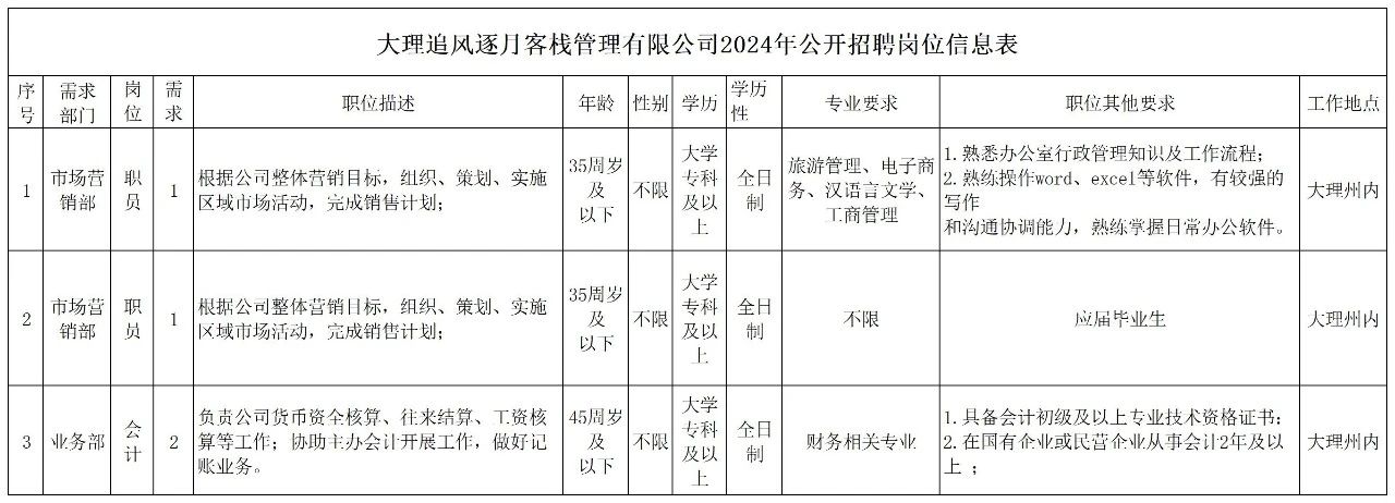 大理追風(fēng)逐月客棧管理有限公司招聘工作人員公告