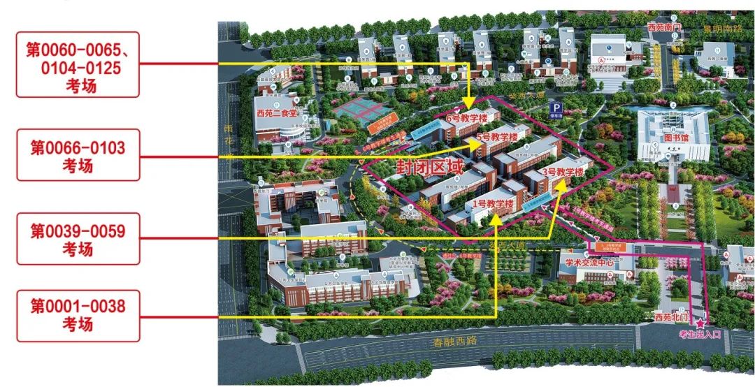 本次考試考場分別設置在昆明醫(yī)科大學呈貢校區(qū)西苑致知樓1號、3號、5號、6號樓??紙鰠^(qū)域分布圖如下: