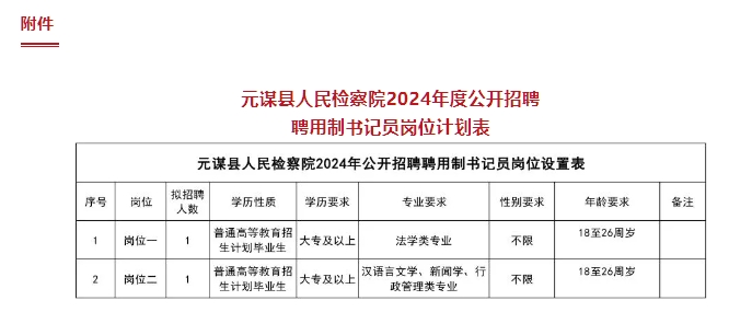 元謀縣人民檢察院計劃招聘省級財政保障聘用制書記員2人。招聘計劃詳見《元謀縣人民檢察院2024年公開招聘聘用制書記員崗位設(shè)置表》(以下簡稱《崗位設(shè)置表》)。